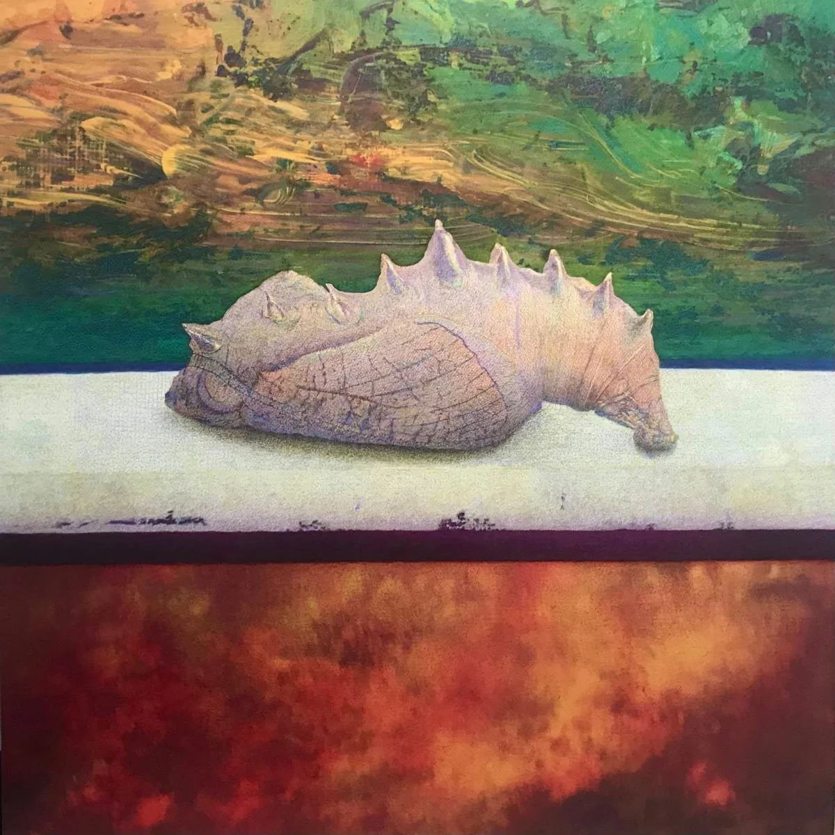 Life-forms symbolic of change and transformation are presented with reverence in these paintings. The subjects are balanced upon mantels that span vibrant abstract backgrounds. The images convey a state of tranquility, yet allude to potential and the precariousness of existence.